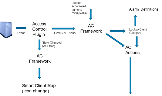 Below, a drawing showing how events are flowing from the access control system on the left hand side and handled by MIP-AC towards the right hand side.