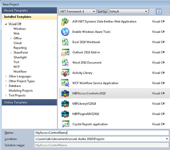Select the “Visual C#” template node on the left and the “MIPAccessControl” on the right.